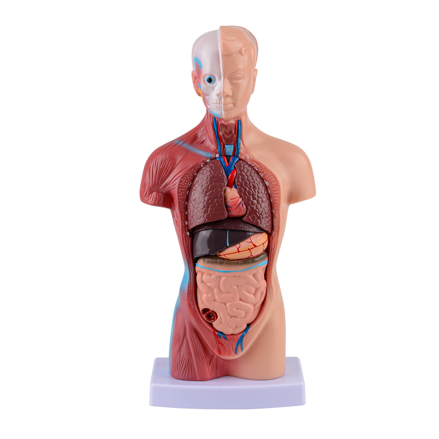 This 15-piece human torso model includes the torso and key organs: two brain halves, heart, esophagus, major artery, four lungs, skull, stomach, diaphragm, liver, pancreas, spleen, and intestine. Each part can be detached and reassembled with ease, and an installation guide is included for hassle-free setup.